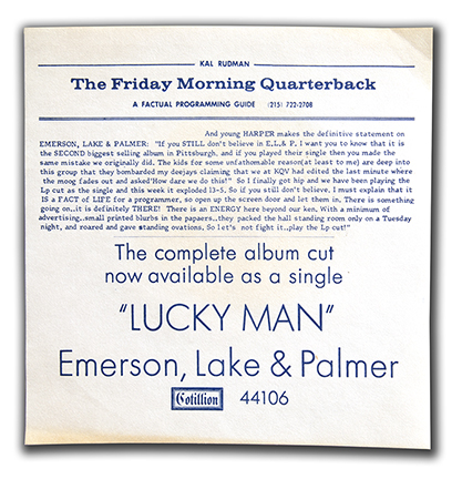 163. Emerson, Lake & Palmer "Lucky Man/SAME" COTILLION 44106 MINT WHITE LABEL PROMO with special PROMO ONLY INSERT MB $50