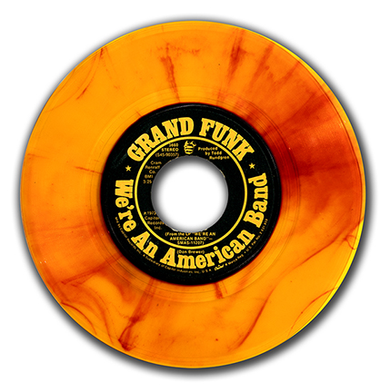 179. Grand Funk Railroad "We're An American Band/Creepin' " CAPITOL 3660 M- YELLOW AND RED VINYL RARE as most of the known copies are yellow vinyl MB $25