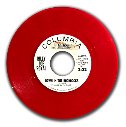 342. Billy Joe Royal "Down In The Boondocks/SAME" COLUMBIA 43305 M- WHITE LABEL PROMO with same song on both sides and pressed on gorgeous RED VINYL, sticker stain on label and wol on B-side MB $20