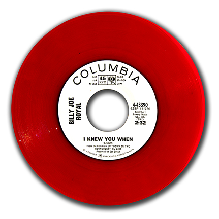 343. Billy Joe Royal "I Knew You When/SAME" COLUMBIA 43390 MINT WHITE LABEL PROMO with same song on both sides and pressed in lovely RED VINYL MB $50