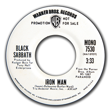 349. Black Sabbath "Iron Man/SAME" WARNER BROTHERS 7530 M- WHITE LABEL PROMO with MONO version on one side and STEREO version on the other side MB $20