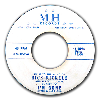 3. Rick Rickels And His Wild Guitar "I'm Gone / You Gonna Go Away" M H RCORDS MHR-2 VG- WHAT A RECORD! FANTASTIC TWO-SIDER from Meridian, Mississippi!!! If you've never heard it, go to YouTube. FIRST AND ONLY COPY I've had in 50 years of record collecting! MB $1,000